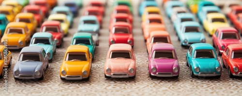 Obraz premium Colorful toy cars arranged in neat rows.