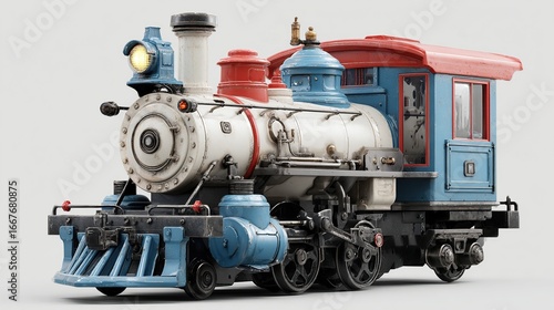© Toko, Naklejka premium Colorful toy steam train with red, white, and blue on a white background