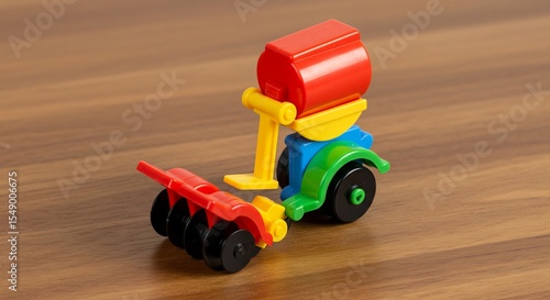 Fototapeta premium Colorful toy tractor gleams under soft light playfully pulling a red plow across warm wood. AI Generated