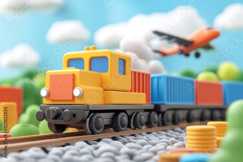 Fototapeta premium Colorful toy train and airplane in a playful landscape 3d render children's...