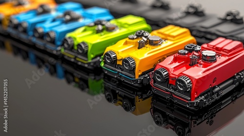 Fototapeta premium Colorful toy trains lined up on a reflective surface, showcasing vibrant...