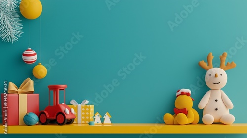 © patpongstock, Obraz premium Colorful toys on a shelf with festive decorations in a playful setting.