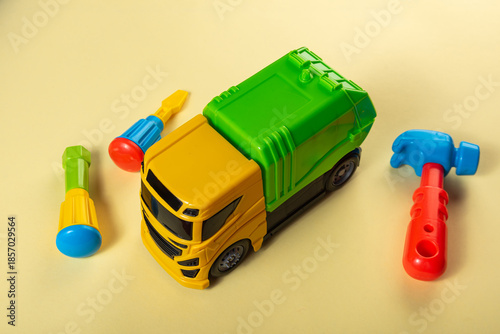 © Mateus, Fototapeta premium Colorful toys on a yellow background