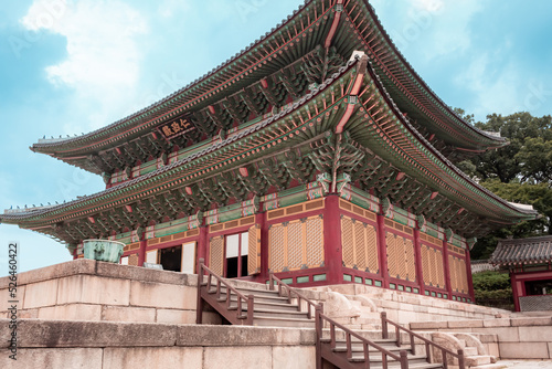 Fototapeta premium Colorful traditional wood Korean architecture temple kings throne room building main hall at Changgyeonggung Palace in Seoul South Korea