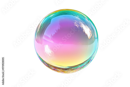 © Sodapeaw, Obraz premium Colorful translucent soap bubble with rainbow hues and reflections. Bright and shiny transparent sphere against a transparent background.