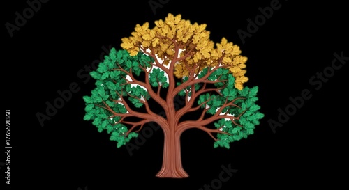 Fototapeta premium Colorful Tree Illustration with Green and Yellow Leaves on Black Background.