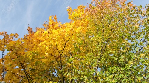 © sunwaylight13, Fototapeta premium Colorful tree in sunny autumn day Blue sky in background.