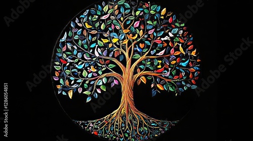 Naklejka premium Colorful Tree Of Life Art Featuring Vibrant Leaves And Birds. Symbolizes...