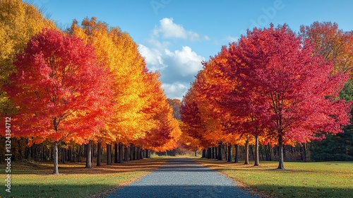 © Sang, Naklejka premium Colorful trees show vibrant autumn foliage, creating a landscape with brilliant orange, red, and yellow shades.