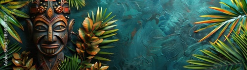 Fototapeta premium Colorful tribal mask surrounded by lush tropical leaves, creating an exotic...