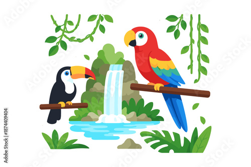 Obraz premium Colorful tropical birds by waterfall in lush jungle scenery