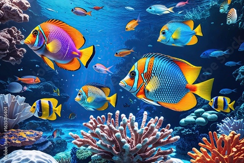 Naklejka premium Colorful Tropical Fish Swimming in a Lively Coral Reef Underwater Environment