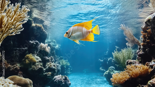 Fototapeta premium Colorful tropical fish swimming in vibrant coral reef underwater scene