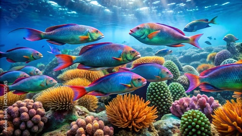 Naklejka premium Colorful Tropical Fish Swimming Over Vibrant Coral Reef Scene