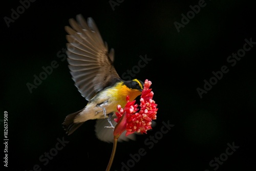 © Udean spinal, Fototapeta premium Colorful tropical hummingbird feeding on a red flower with green wings and a long beak in wild nature