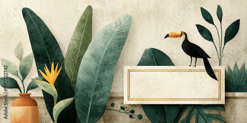 Fototapeta premium Colorful tropical illustration featuring lush green leaves, vibrant flowers, and a toucan perched on a branch, ideal for nature-themed designs and creative projects
