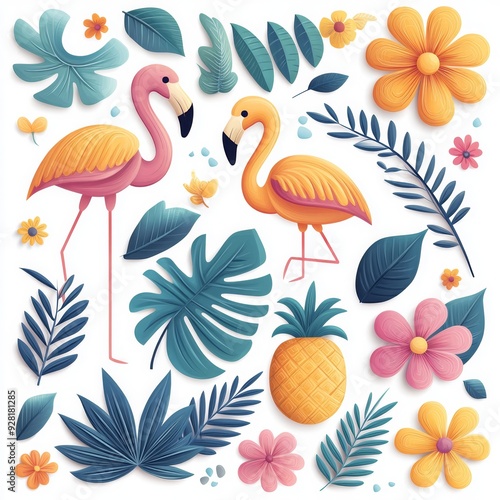 © Preeyanuch, Naklejka premium Colorful tropical illustration with flamingos, flowers, leaves, and a pineapple. Perfect for summer or beach-themed designs.
