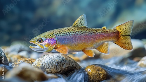 © Iurii, Fototapeta premium Colorful trout swimming among pebbles in a crystal-clear river during daylight