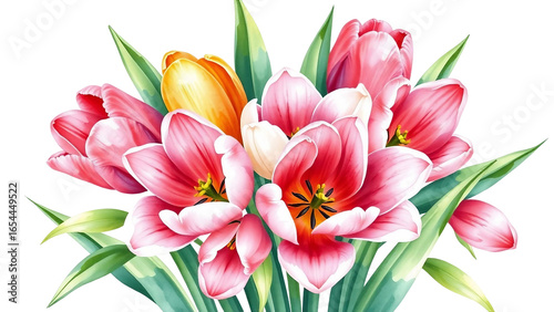 © Kathy, Naklejka premium Colorful tulip bouquet in watercolor style, isolated on transparent background, spring floral illustration.