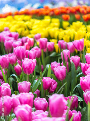 © Chanawin, Fototapeta premium Colorful tulip flower garden, pink yellow and orange