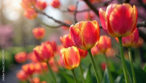 © ຈໍາປາ ຈໍາປາ, Obraz premium Colorful tulip flowers blooming in a tree's branches, blossoming, flowers