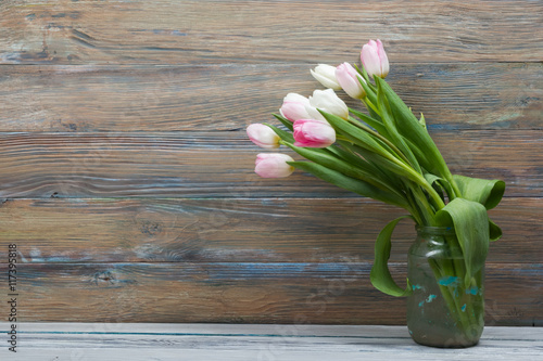 © projectio, Naklejka premium Colorful tulips flowers on wooden table. Top view with copy space