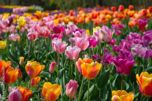 Fototapeta premium Colorful tulips in sunlight with blurred background, vibrant spring flowers