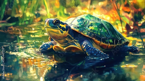 © Alexander, Obraz premium Colorful turtle in pond, sunlit water.
