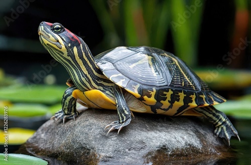 Obraz premium Colorful turtle resting on a rock by calm water surrounded by greenery,...