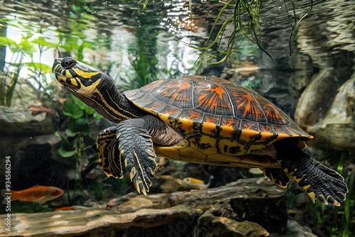 Obraz premium Colorful turtle swimming in aquarium with underwater plants and rocks