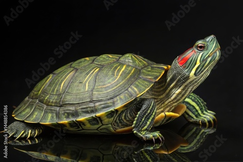 © Anusa, Obraz premium Colorful Turtle with Striped Shell and Vibrant Red Markings