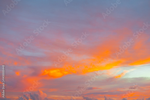 © Balnyes Visuals, Fototapeta premium Colorful twilight sky filled with dramatic orange clouds during a golden sunset.