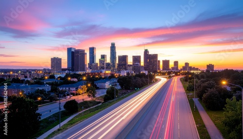 Fototapeta premium Colorful twilight sky over a downtown cityscape with highway light trails.