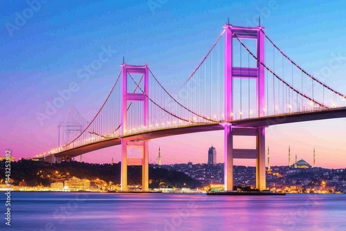 © Panithi, Obraz premium Colorful Twilight Skyline with Modern Bridge over Water in Istanbul