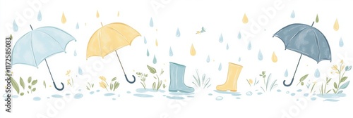 Fototapeta premium Colorful umbrellas and boots playfully arranged among raindrops and grass in...