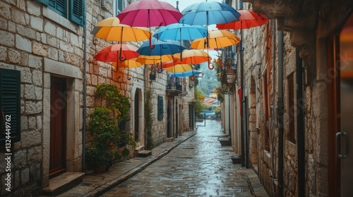 © nur, Fototapeta premium Colorful umbrellas hang above a rain-soaked, narrow cobblestone street in a historic European town.