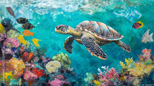 Obraz premium Colorful underwater scene with sea turtle and coral reef