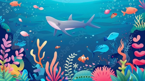 Fototapeta premium Colorful Underwater Scene with Shark and Coral Reef
