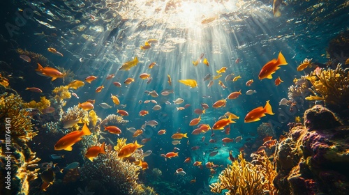 © kaiserseeing, Naklejka premium Colorful Underwater Scene with Tropical Fish and Coral Reef