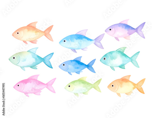 © Thanat, Naklejka premium Colorful Underwater Watercolor Art: A captivating composition showcasing a diverse array of vibrantly colored fish.