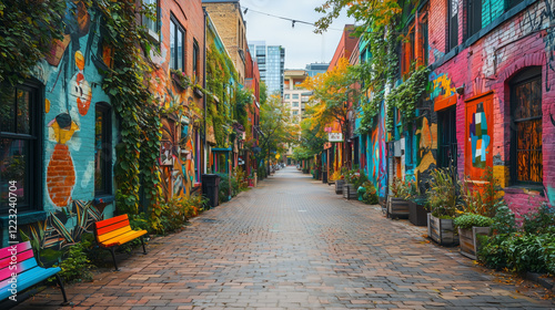 Fototapeta premium Colorful Urban Alleyway with Vibrant Street Art and Greenery