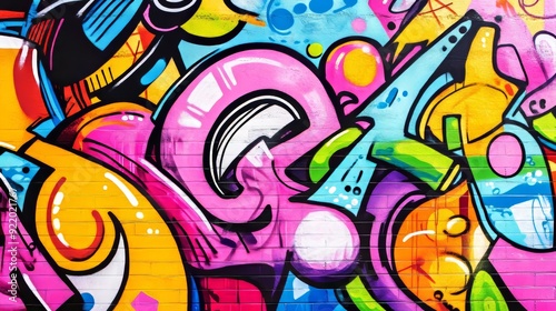 Fototapeta premium Colorful urban graffiti wall mural showing abstract designs creating modern...
