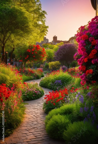 Fototapeta premium colorful urban green spaces featuring dense flowering unique inviting pathways tranquil city environment, aesthetic, area, botanical, biodiversity, blooming