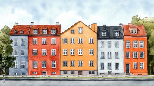 © warunthorn, Naklejka premium Colorful Urban Landscape with Charming Houses in Watercolor Style