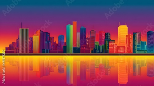 Obraz premium Colorful Urban Skyline at Sunset with Vibrant Reflections on Water Surface