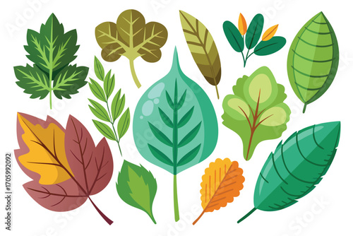 © Lipon, Fototapeta premium Colorful Variety of Cartoon Leaves Representing Different Seasons and Botanical Art Styles Isolated on White Backdrop