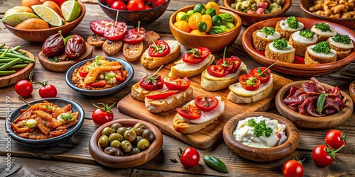 Fototapeta premium Colorful variety of tapas perfect for sharing, tapas, colorful, array,...