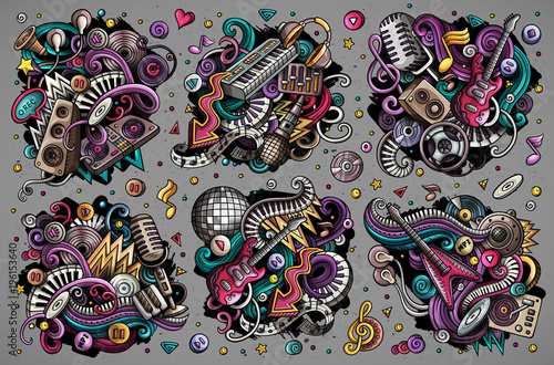 Fototapeta premium Colorful vector doodles cartoon set of disco music objects combinations