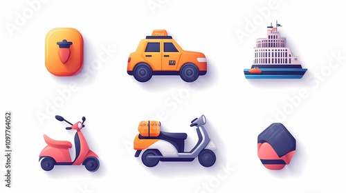 Fototapeta premium Colorful Vector Icons of Various Transportation Modes Including Taxi, Scooter, Ship, and Delivery Bike on White Background for Creative Projects and Web Use