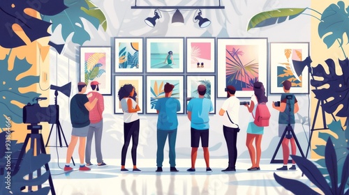 Obraz premium Colorful vector illustration of a photography contest, with judges reviewing...